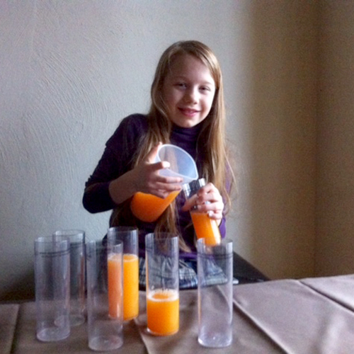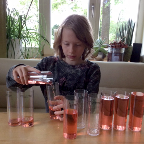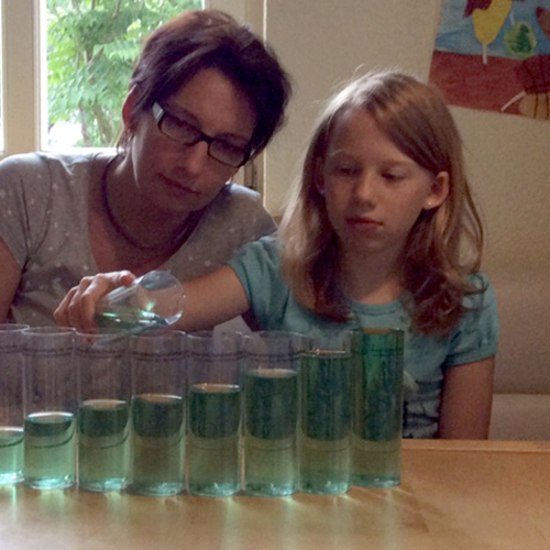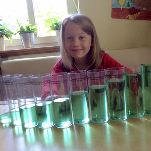 Mit Hilfe von zylindrischen Gläsern und gefärbtem Wasser werden Zahlen sichtbar gemacht. Dabei wird die Zahl als abstraktes Symbol auf spielerische Weise anschaulich und sinnlich erfahrbar. Der Umgang mit Zahlen verliert seinen Schrecken und mit ihm verliert sich auch die Abwehhaltung des Kindes.